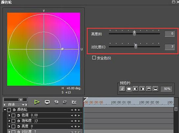 1、在特效中找到组合滤镜,将滤镜拖到视频素材上面,再打开组合滤镜的设置对话框,在第一个滤镜选项中选择“颜色轮”,调整:亮度:0,对比度:7。