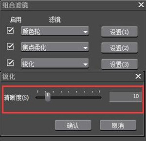 3、在第三个滤镜选项中添加“锐化”,设置:清晰度:10。
