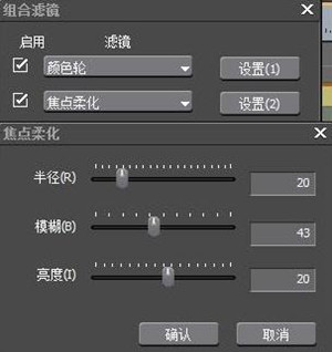 2、在第二个滤镜选项中选择“焦点柔化”,设置:半径:20,模糊:43,亮度:20。