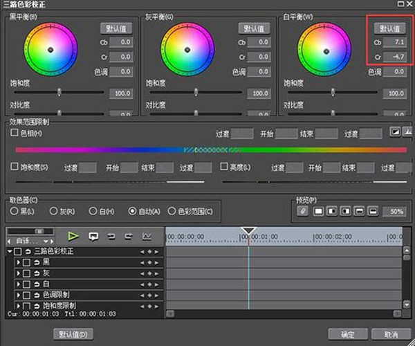 4、在第四个滤镜选项中添加“三色路校正”,这里主要调整的是白平衡,cb:7.1、 cr:-4.7。