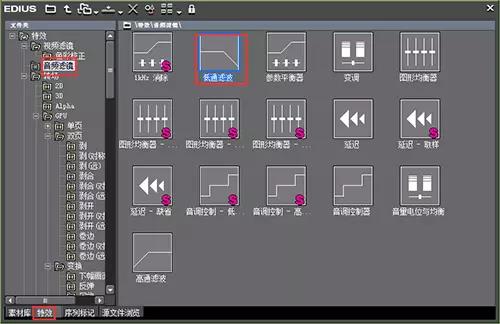 2、然后,打开特效面板,在“音频滤镜”中选择“低通滤波”,并把它拖拽到素材上。