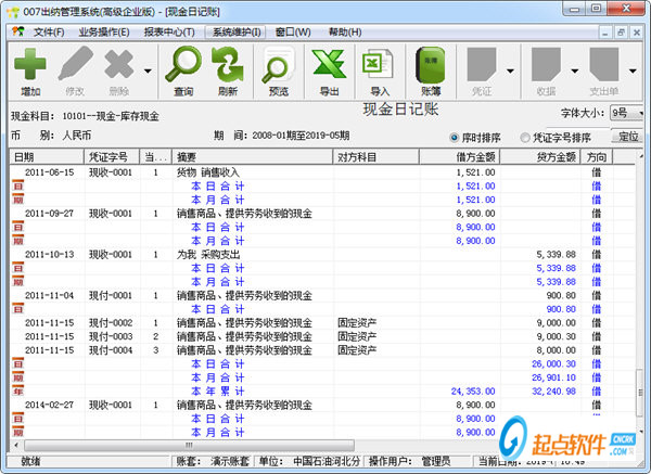 12、可以按金额范围、结算方式、收入或支出类别、日期、期间、对应科目、往来单位、摘要、经办人员、现金流量表项目等等各种项目来灵活 组合查询统计账簿报表。