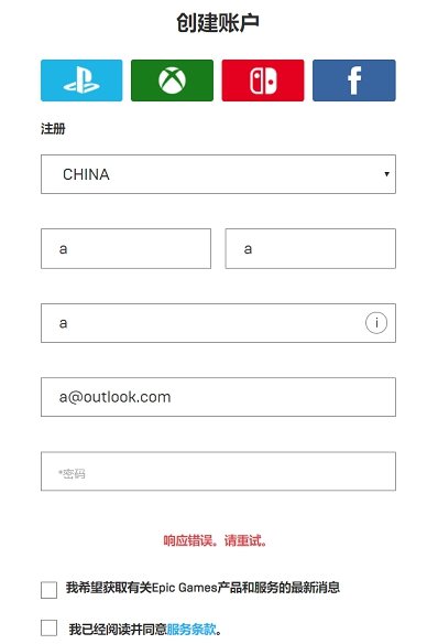 epic games注册账号响应错误解决方法许多玩家卡在了Epic账号注册这一步,注册页面提示“响应错误。请重试。”无法进入下一步,如下图所示: