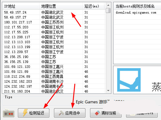 接着点击【检测延迟】,然后选中延迟最低的地址,点击【应用选中】即可进行加速