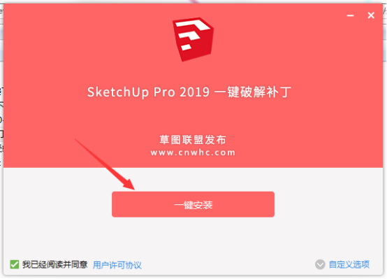 下载草图大师2019【sketchup2019破解版】中文破解版的安装包,然后解压安装包,里面有草图大师的一键和谐补丁,我们先打开安装程序。 如图一。