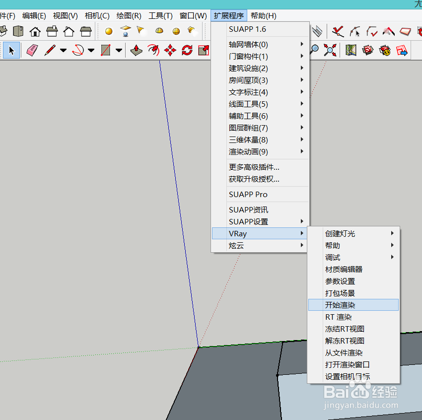 在安装好vary插件的电脑上打开su模型选择好角度。点击上方的扩展程序。