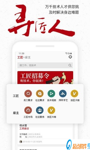 【匠人】从此告别求职奔波,从别人挑自己转变成自己挑活儿做。一机在手,即可与雇主实时沟通,自主找活儿;