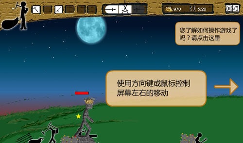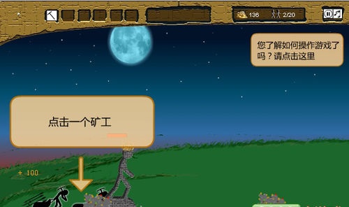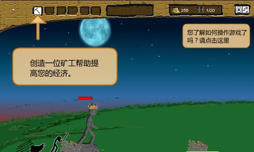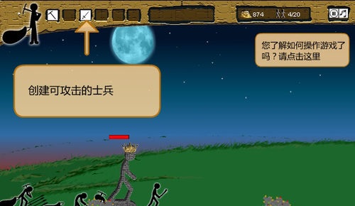 火柴人战争中文版怎么玩?火柴人战争中文版攻略第1关:先造2个矿工,有钱了造2个弓箭手,其余的钱全造剑士,顶几个回合就胜利了。
