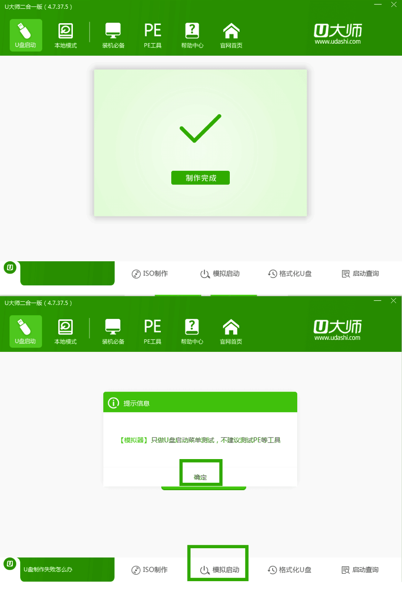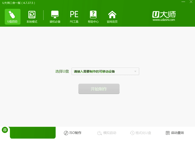 打开u大师启动二合一版,将准备好的U启通插入电脑usb接口并等待本工具软件对U启通进行识别,由于此次u启动采用全新功能智能模式,可自动为U启通选择兼容性强于适应性高的制作方式,相较过去版本可省去多余的选择操作。故而无需再做任何改动,保持默认参数设置并直接点击“开始制作”即可:友情提醒新手朋友认真阅读工具提示,另外在使用本工具前,对U启通移动硬盘等做好资料备份,重装系统前备份好你的宽带账户和密码。由于本工具涉及对可移动磁盘(U启通)的读写操作,部分安全杀毒软件在使用过程中误报为病毒或者木马,会导致制作失败,建议您在下载安装使用本工具前务必关闭安全相关和杀毒软件