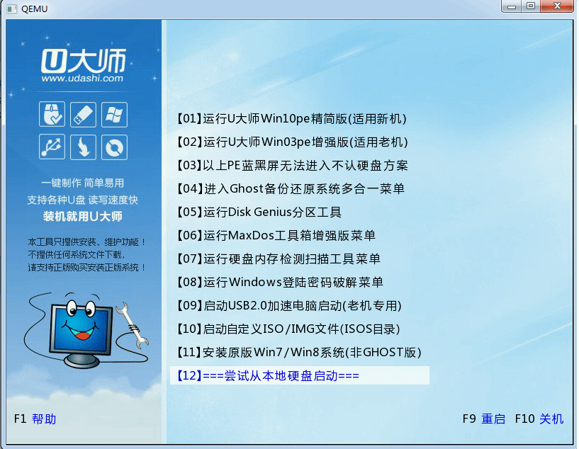 随后若弹出下图所示界面,说明U启通启动盘制作成功(注意:此功能仅作启动测试,切勿进一步操作)。按“Ctrl+Alt”释放鼠标,点击右上角的关闭图标退出模拟启动测试。