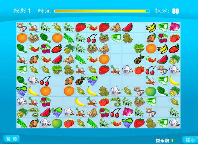 果蔬连连看顾名思义就是以“水果”和“蔬菜”两种提材为主的一种“连连看小游戏”,玩法规则简单容易上手,只要将相同的两张进行连接,并且路径转弯不能超过2次,男女老少都适合玩。