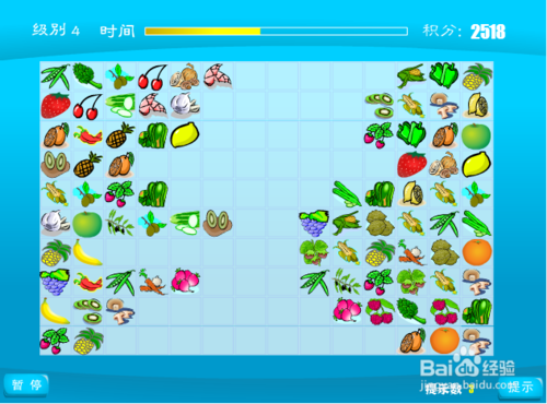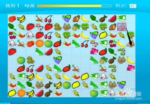 2、使用鼠标将相同的三张或多张果蔬图片进行碰撞或规律排列达到消除条件;