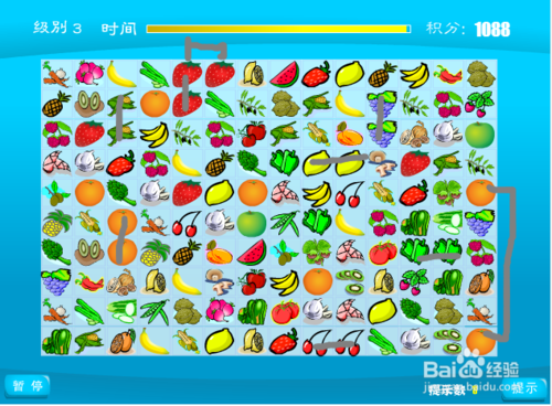 1、使用鼠标将相同的两张鲜美的果蔬图片进行连接,并且路径转弯不能超过2次达到消除条件;