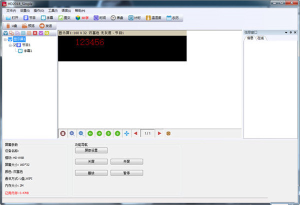 打开《HD2018》软件主界面如下图:显示屏可以分组管理,工具栏可以分为两栏,也可显示为一栏,信息窗口可以提示当前指令是否发送成功,也可显示当前在线设备。