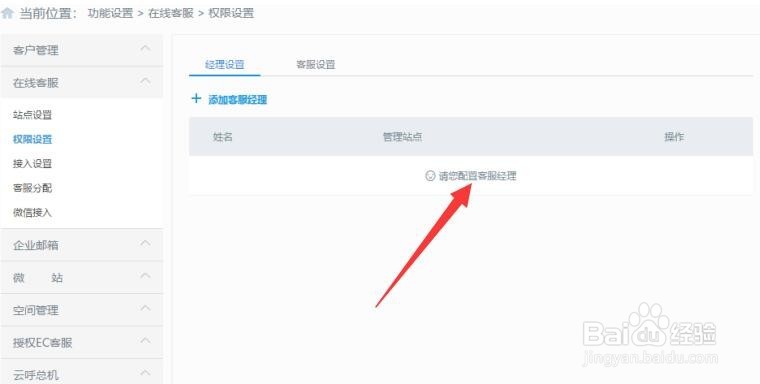 选择“经理设置”显示客服经理列表,列表中显示“姓名”“管理站点”“操作”等字段,列表在初始时为空,提示请您配置客服经理,如图所示