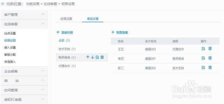 在客服设置里面可以进行客服的分组,和业务种类的划分,如图所示,不同的客服负责不同的业务相关。