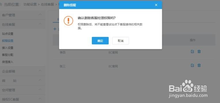 当你决定要删除某个客服的权限的时候,点击“操作”中“删除”按钮即可,删除后,该人将不能再看到相关的数据信息了。