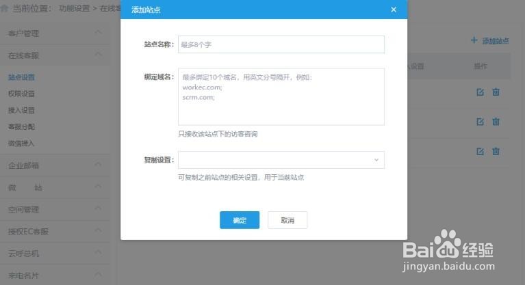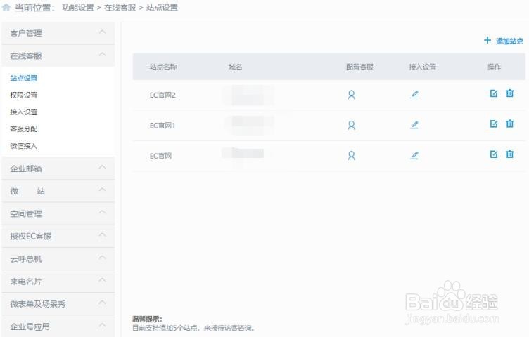 点击“添加站点”即可,命名可以输入16个字符,最多可以绑定10个不同的域名,绑定后只接收该站点下的访客咨询!