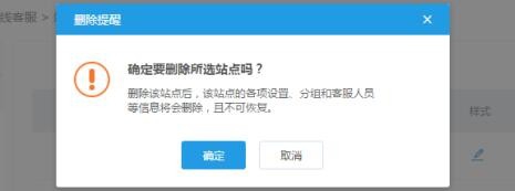 点击“操作”下“删除”按钮弹出“删除提醒”弹窗即可,不过需要注意的是:删除后包括你站点下面设置的客服人员等相关信息也都一并删除了。(如图所示)