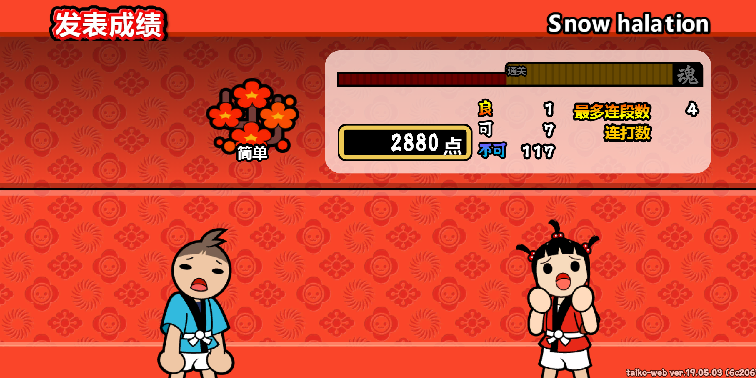 蓝色:敲打鼓边。 分数随着连段数和精确度评定。“良”的分数是“可”的分数的两倍。