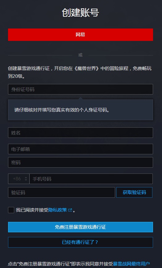 如果你是一位新的冒险者,或是想要重新开始,请创建暴雪游戏通行证。