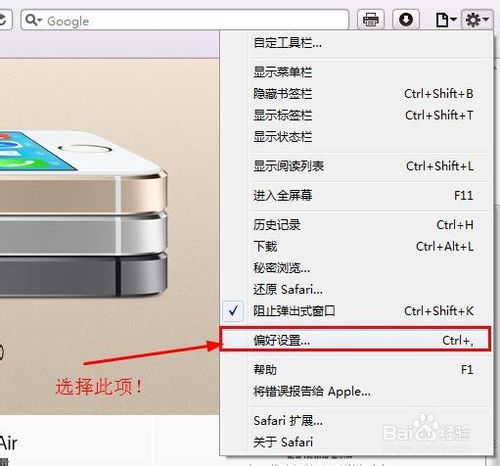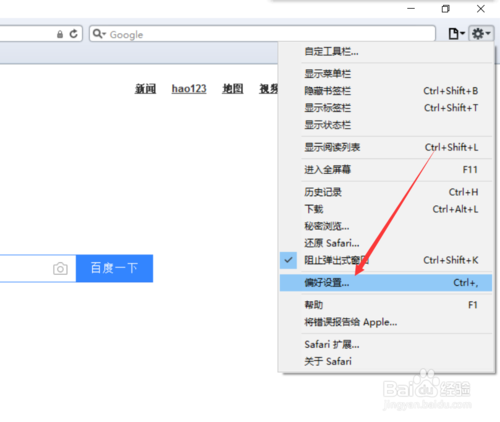 2、在Safari设置弹出的子菜单里直接点击【偏好设置】,如下图所示。