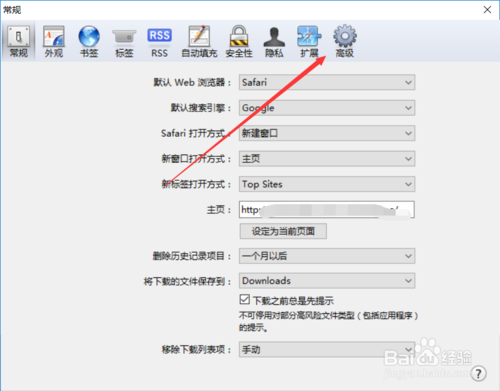 3、在打开的Safari偏好设置对话框后直接点击上面导航的【高级】选项,如下图所示。