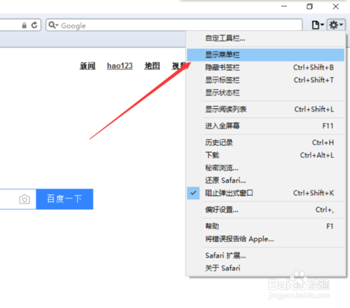 5、设置好显示开发菜单后,再次点击Safari浏览器右上角的设置图标,然后再点击【显示菜单栏】,如下图所示。