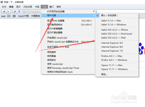 7、将鼠标移动到Safari开发选项子菜单里的【用户代理】选项上,此时会在展开三级菜单,这里就是Safari浏览器的所有兼容模式了,如下图所示。
