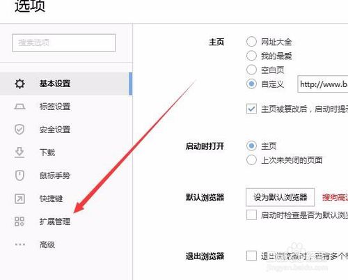 2、在打开的选项窗口中,点击左侧的“扩展管理”菜单项