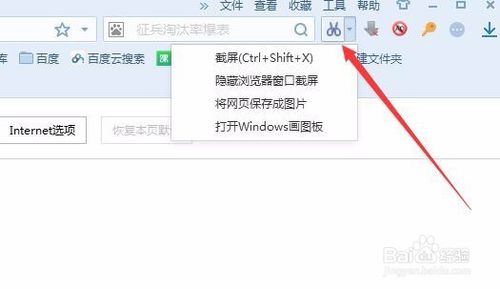 6、安装好后,在搜狗浏览器的工具栏上就看到了“截图”的图标了,点击截图工具按钮后可以看到下拉菜单
