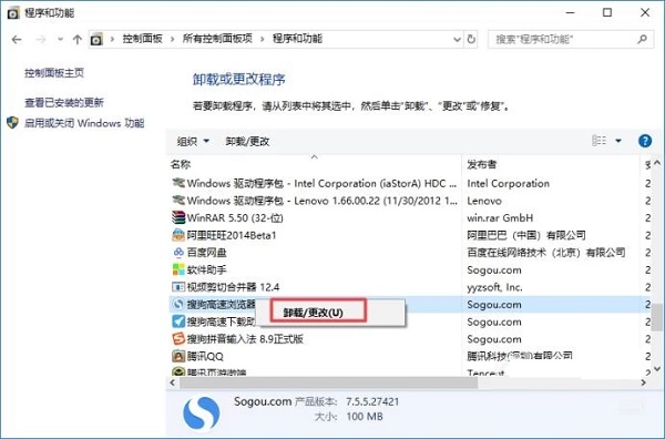 4、进入程序和功能后,我们找到搜狗浏览器,然后右击选择卸载/更改,之后就会弹出卸载的界面,我们点击卸载就可以了。