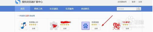 3、在弹出的搜狗浏览器拓展中心的右边输入框中输入你想要添加的插件的名称,比如百度搜索,然后点击右边的搜索按钮