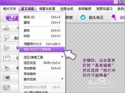 接下来为避免图片被拉伸打印,我们可以先使用彩影自带的冲印尺寸规格裁剪功能。点击最顶部菜单栏的“基本编辑”,选择“相片冲印尺寸规格表。