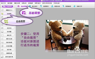 我们可以通过点击软件顶部导航栏的“基础调整”,然后使用左边面板的“自由裁剪”按钮来裁剪照片。