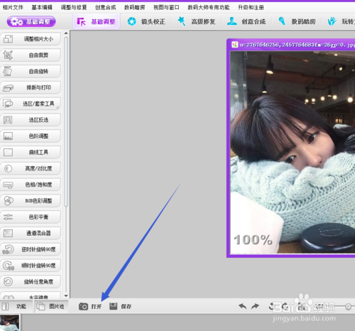 首先我们点击左下角的打开按钮,用我们这个软件打开你想要打印的图片。其实我们完全可以直接使用这个软件的打印命令打印照片,但将这软件只当图片打印软件用,显然浪费了它“中国第一图像处理软件”的美誉。