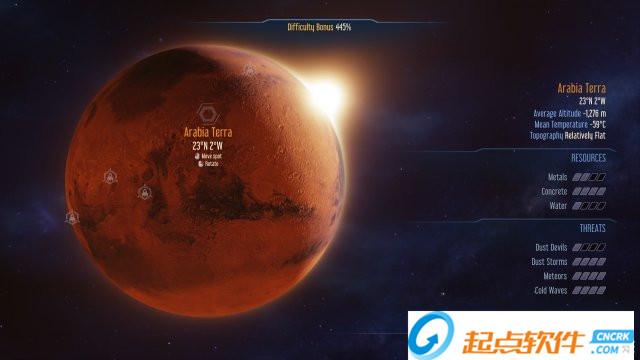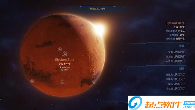 在完成火箭的购买清单后,需要为初始火箭在火星表面多处可用登陆点中选择一个进行登陆,单击选中登陆点后,该区域的资源总体分布情况及自然条件会于右侧显示。
