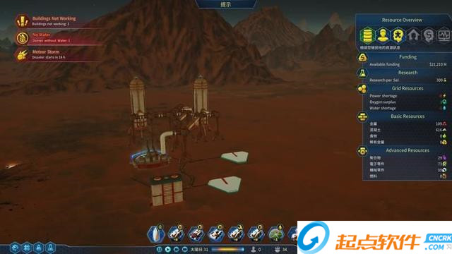 流星在火星上可能是地狱,或者是变相的祝福。一个警告将显示流星将在撞击之前击中的区域。影响区域内的任何物体都将被损坏,需要立即进行维护,对同一设施的反复冲击可能会导致其被破坏,此时只能重建或清除(如果您已经研究过该技术)。
