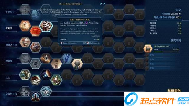 游戏中的科技点数用于升级科技树,科技树分为生物科技、工程学、机器人科技、物理学、社交、突破性科技六大项分类,每种分类都拥有非常繁多的科技项待研发。