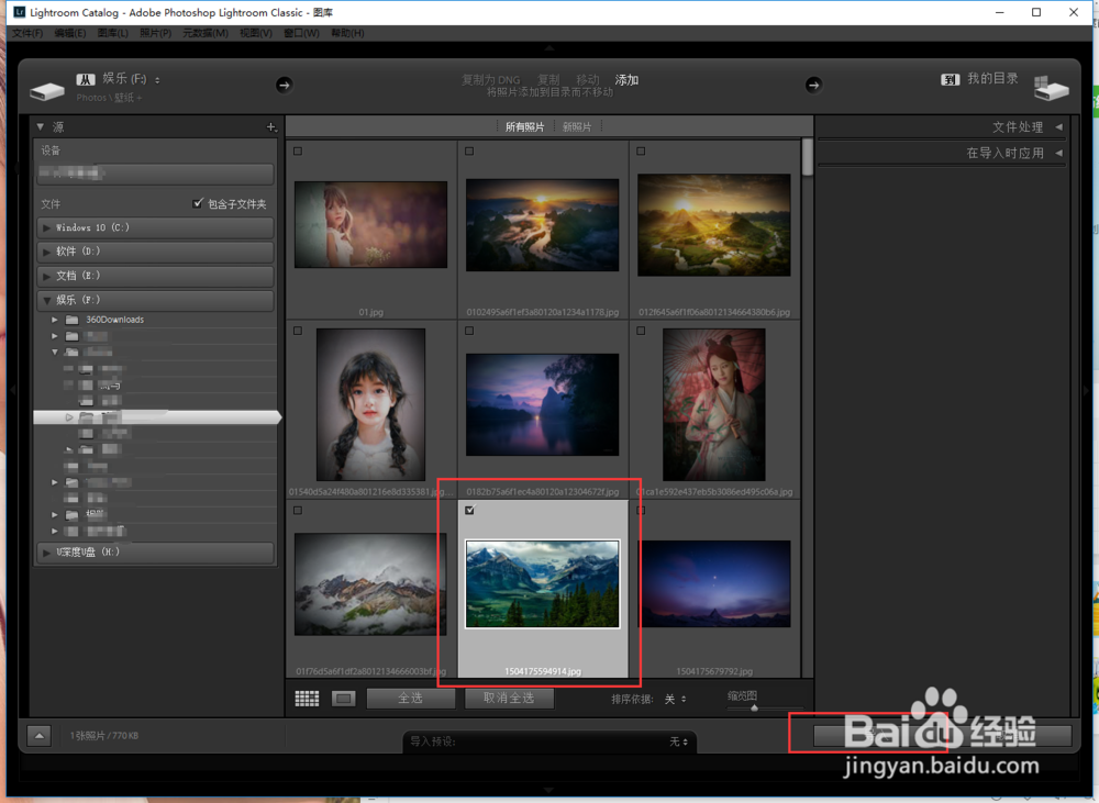 在左侧找到你要打开并调整的照片的目录,在右侧选中照片,并点击【导入】。