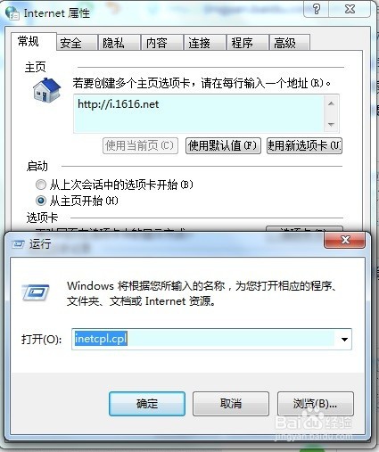 运行中输入:inetcpl.cpl→确定,打开Internet 选项。