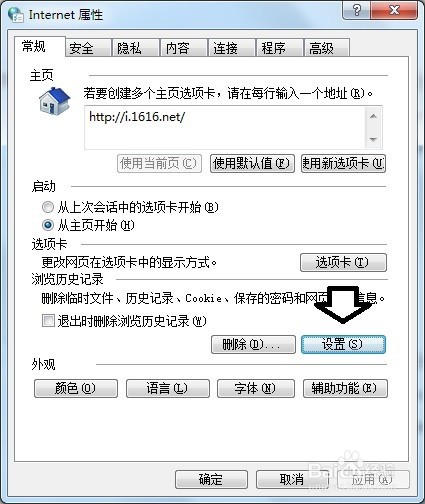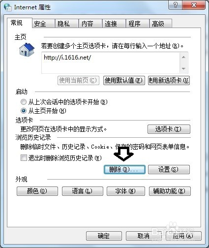 6、注意:一般不建议勾选:退出时删除浏览历史记录 选项。(除非在别人电脑中使用浏览器)这是因为操作系统有优先读取缓存的习惯,这也是加快系统运行的措施之一。只有当浏览网页经常出错,才有必要清理一下浏览器的缓存文件。