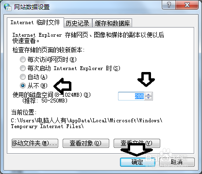 4、网站数据设置→检查储存的页面的较新版本(每个网页检查也是需要时间的)→从不。再加大磁盘储存空间(如果是固态盘,不建议外移浏览器缓存到机械盘)→确定。