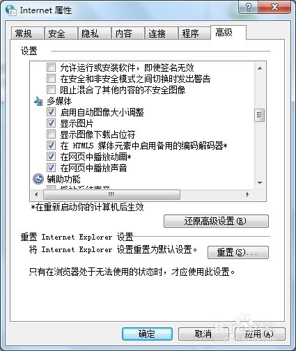 7、有些老的攻略建议将Internet 选项属性→高级→多媒体→取消:显示图片、在网页中播放动画、在网页中播放声音等选项操作。这样做之后,网页只显示文字,一般不适合现在的网页浏览,因为很多子项都是图片菜单,那样设置之后,就打不开下级菜单了,得不偿失。至于说系统中本来就不设置声音(静音),倒是可以将网页播放声音的选项去除选中→确定。