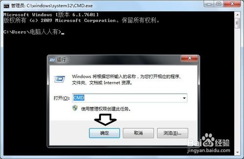 开始→运行→输入:CMD 点击确定(或按回车键),打开命令提示符窗口。