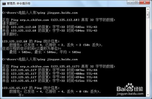 9、然后,ping 经常使用的网站主页(逐一记录下来),比如百度知道,百度网盘,百度经验,新浪博客等。这里有一个有趣的现象,虽然ping同一个域名,可能会有不同的IP地址出现(很多网站会维护,经常换服务器)。