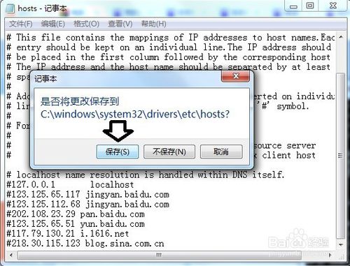 11、将域名和IP地址对应的数据记录在hosts文件中保存(中间有空格)。这样可能会加快网页打开的速度(免去DNS解析的过程)。最后勿忘保存,并及时打开该网页验证,正确无误,才进行下一个测试和添加。