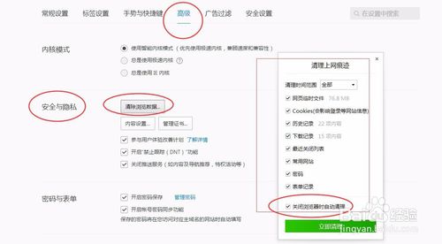 2、点击选项“清除浏览数据”,全部选择——然后别忘了最下方的一个选项:“退出后自动清理”!记性不好的小伙伴记得要点上,即使自己忘记建立隐私窗口了,也再也不用担心自己登陆的密码或者历史记录,被别人不小心翻到了!