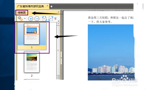 2、PDF文件在编辑器中打开之后,在编辑器左侧的缩略图中,会有整份文件各页面的缩略图,鼠标左击选中首个缩略图。