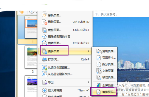 3、接下来,鼠标再右击首个选中的缩略图,之后鼠标点击右侧列表中显示的更多页面选项,再选择点击右侧的编排页码选项。